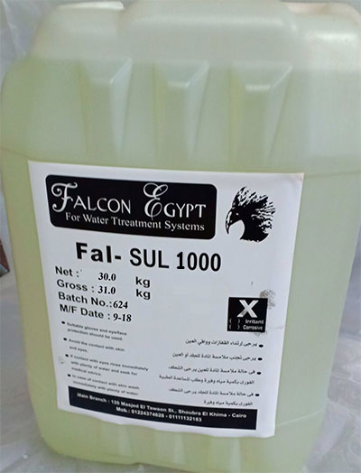 Description and use: Fal-Sul1000 is a catalyzed sodium based compound, which reacts with oxygen to form sodium sulphate. Protecting the Boiler from corrosion problems. It also contains Anti scaling Polymer and a neutralizing amine to prevent scale formation And to protect the condensate line as well.